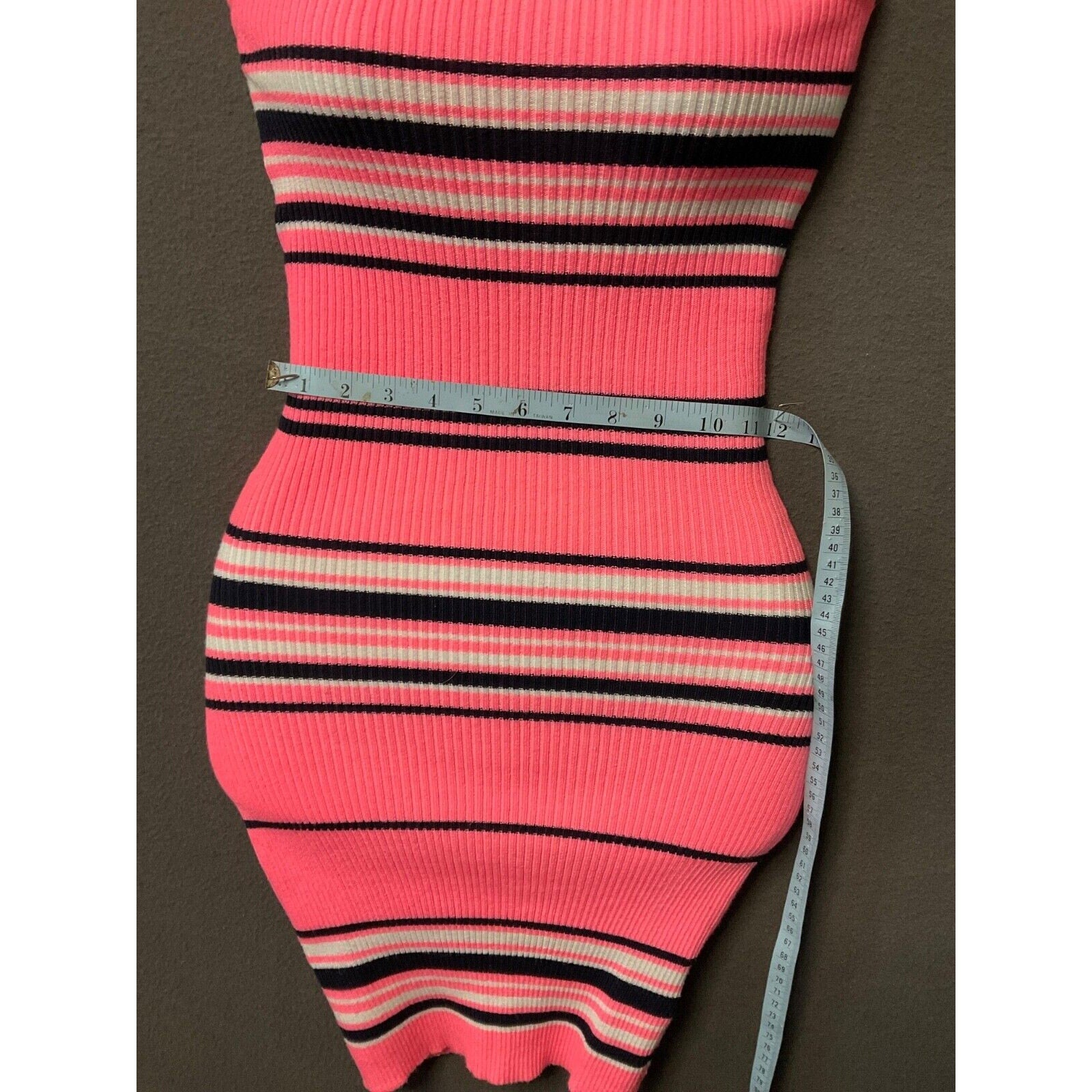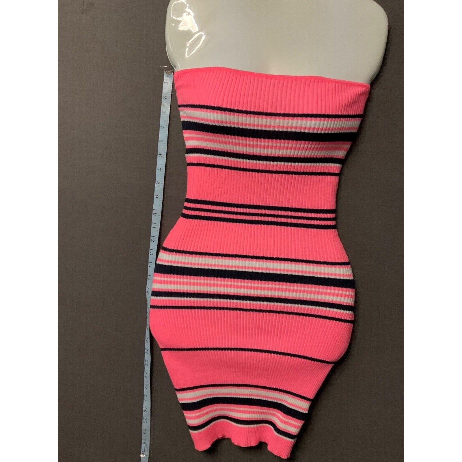 Awesome USA Pink Striped Ribbed Halter Dress in size Small. This mini dress features a bold pink and striped design, ribbed knit fabric, and a lace-up open back for a trendy look.