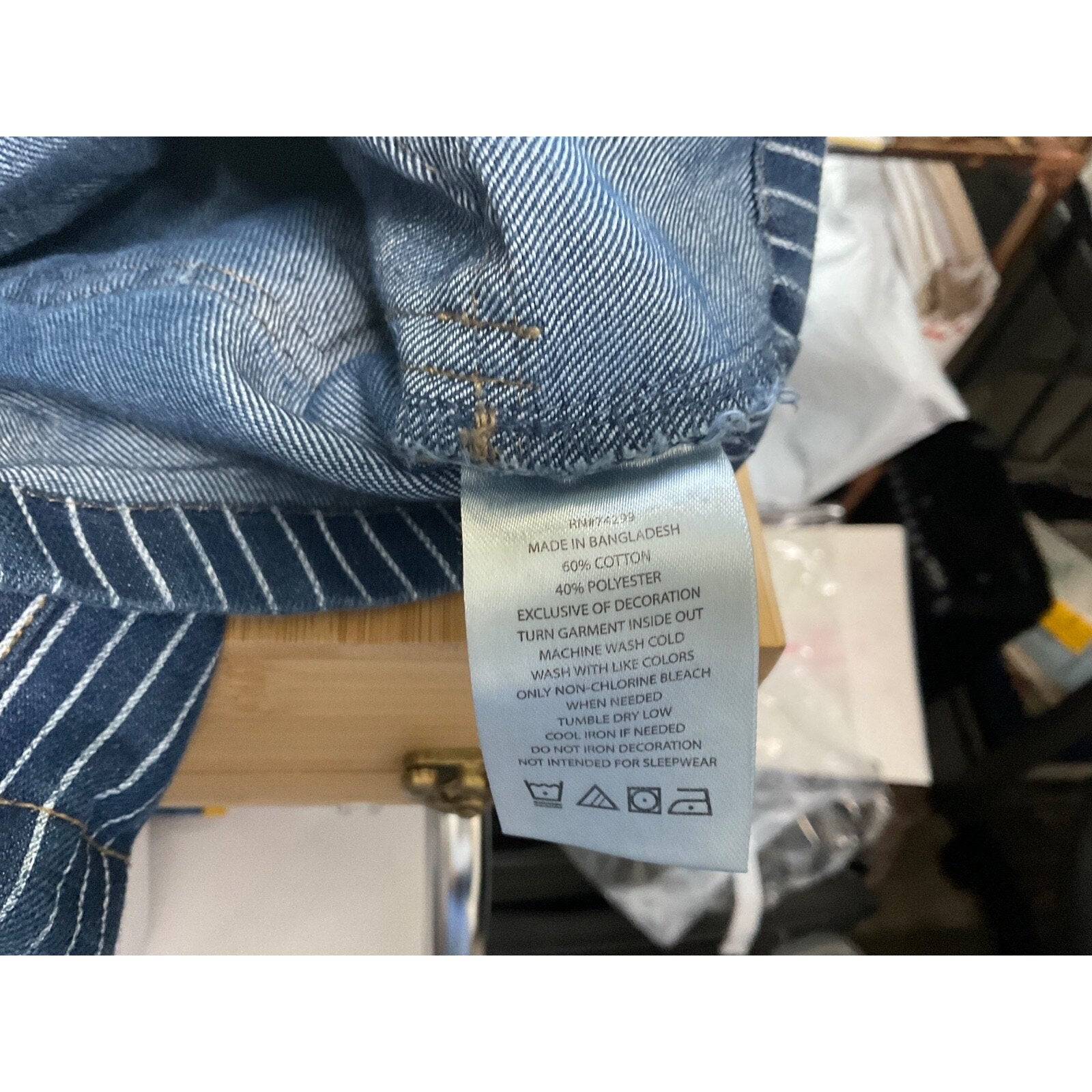 DKNY girls’ denim overall dress in size 6X with classic blue and white pinstripes. Adjustable shoulder straps, front bib pocket, and two front hand pockets. Embroidered “DKNY” on the chest.