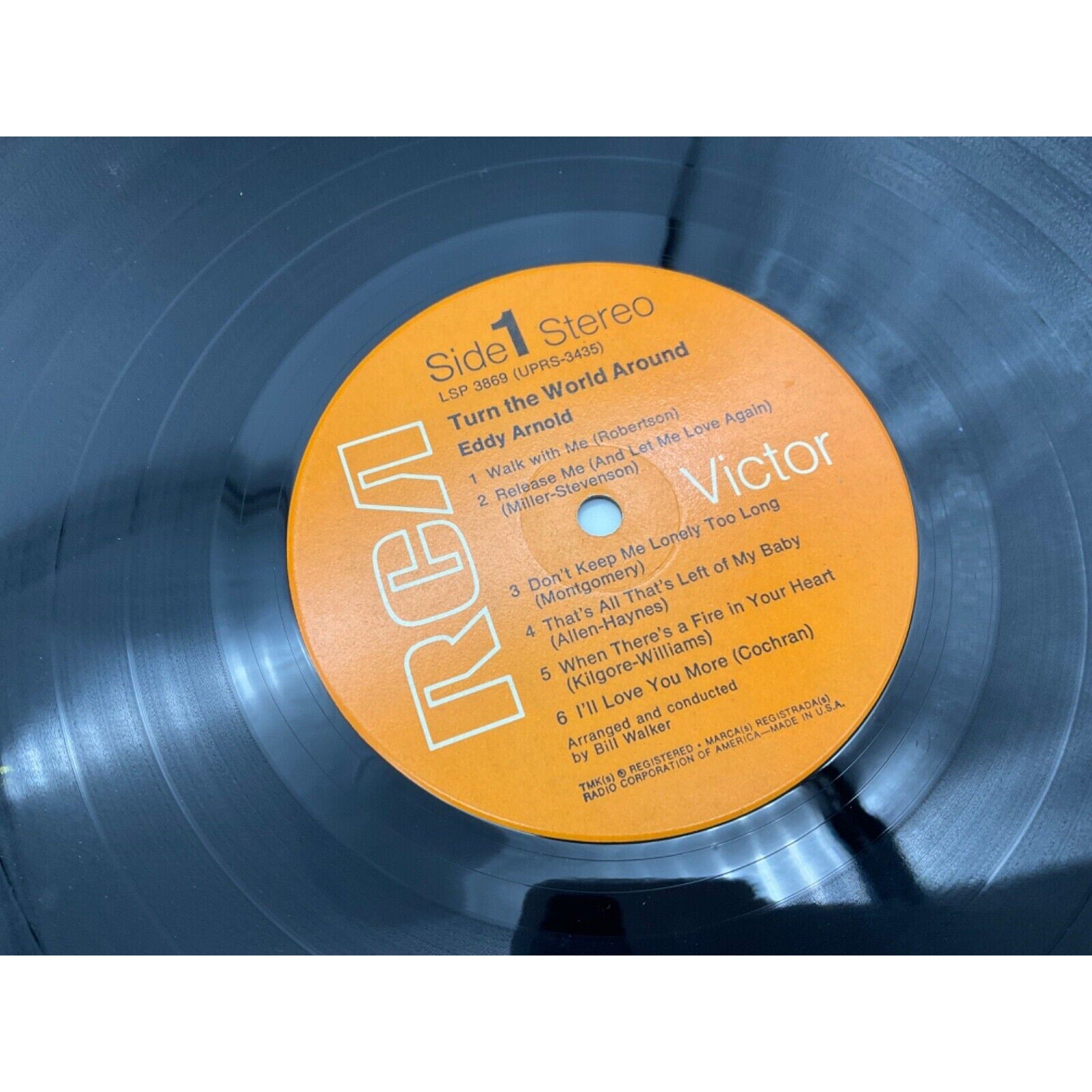 Explore the classic country sounds of Eddy Arnold with this pre-owned "Turn the World Around" vinyl LP. Released in 1967 by RCA Victor (catalog number LSP 3869), this first edition record is a valuable find for any music enthusiast. The record has some surface scratches and is missing the inlay. However, the sleeve is in great condition and still features the original shrink wrap.