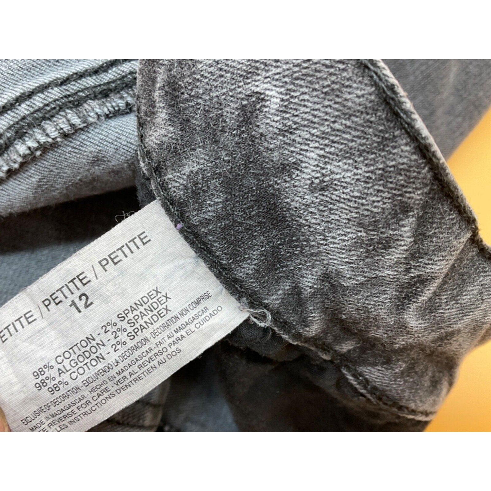 Gloria Vanderbilt jeans, size 12 Petite, in faded black. Made of a comfortable cotton-spandex blend, these jeans offer flexibility and a flattering fit. Features include a 5-pocket design and a 32-inch waist with a 28-inch inseam. Made in Madagascar. Note: There is some wear at the end of one pant leg. Condition: Good.