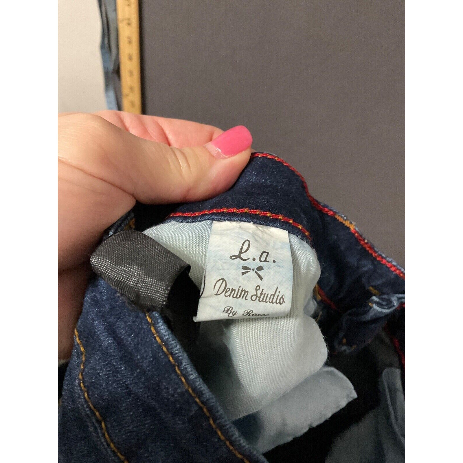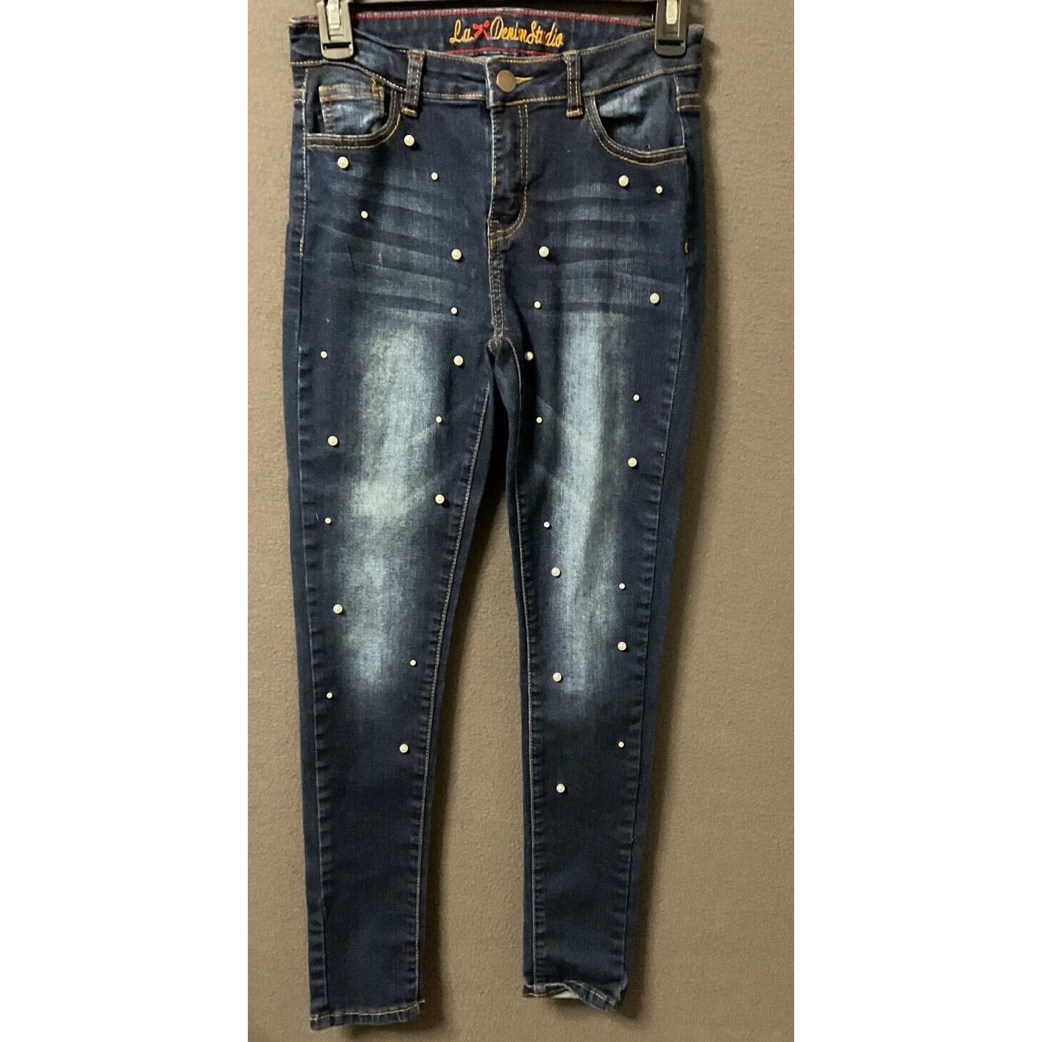Trendy La Denim Studio skinny jeans in a size 3. Features pearl embellishments across the front, a flattering skinny fit, and a dark wash design. Stretch fabric for comfort and style. Perfect for casual or dressed-up looks.