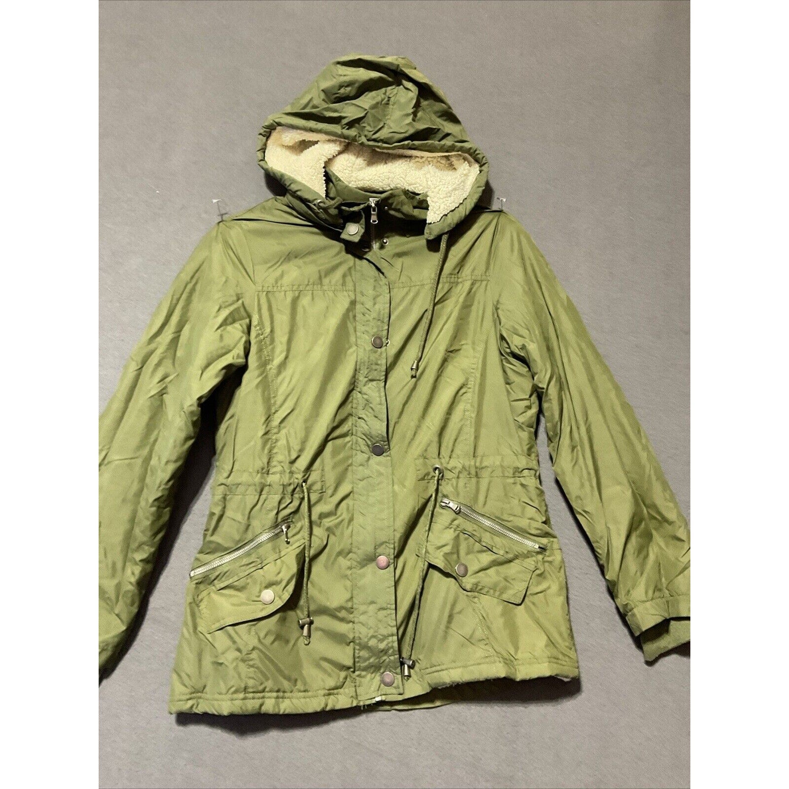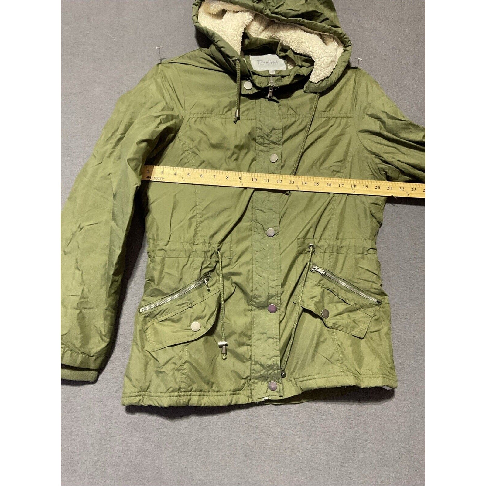 Stay warm and stylish this winter with the Snobbish Collection Women's Hooded Winter Jacket in olive color. Despite being labeled as Extra Large (Runs small), possibly a junior size. Please refer to the provided images for accurate measurements to ensure a perfect fit.