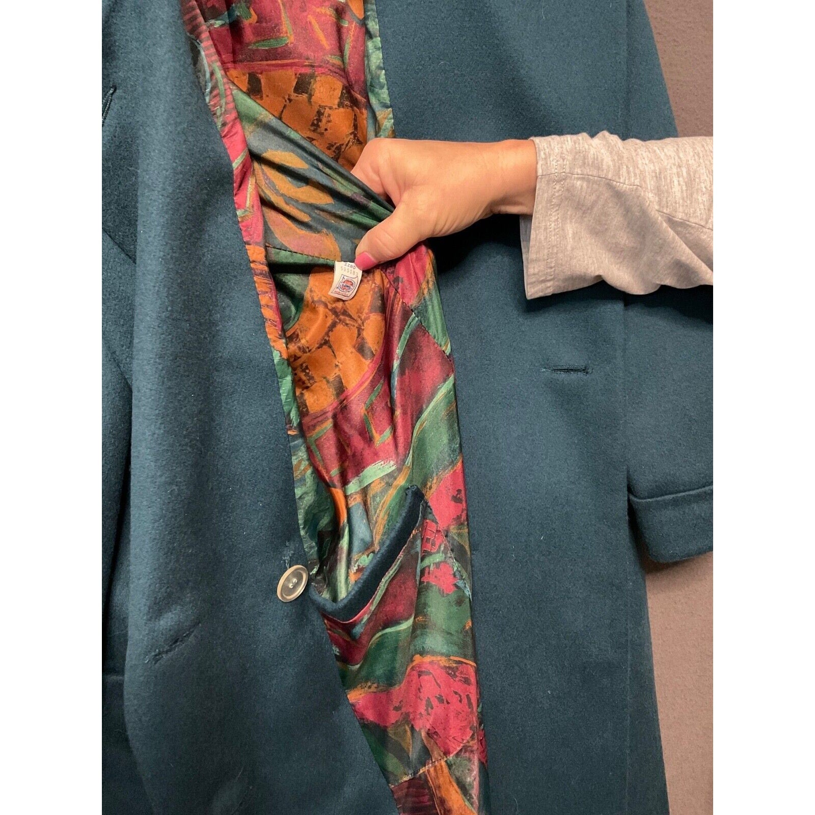 This is a vintage Alorna Super Fina double-breasted wool blend coat in a striking blue color, made in the USA. It features a vibrant, artistic lining, large lapels, front pockets, and a long silhouette. The coat is missing one button but is otherwise in great condition with no major flaws.