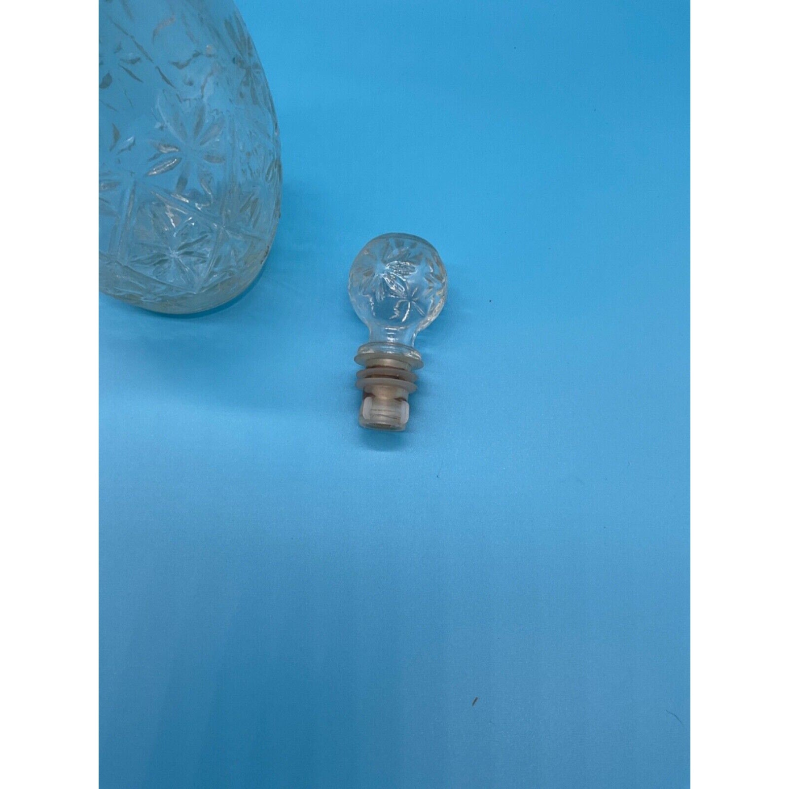 This is a stunning vintage 1970s starburst cut glass decanter with a matching stopper. Perfect for serving wine or spirits, this beautiful piece is ideal for adding a touch of elegance to your barware collection or for hosting parties.